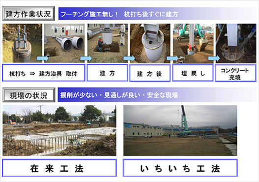 杭基礎が必要な軟弱地盤において、基礎・杭・柱を一体化させた、メタルビル独自の基礎工法。基礎梁と杭本数が減らせるため、コンパクトな基礎が実現します。短工期化のメリットに多くのお客様の評価をいただき、適用事例が増大しています。